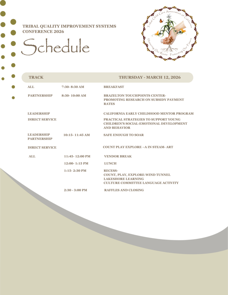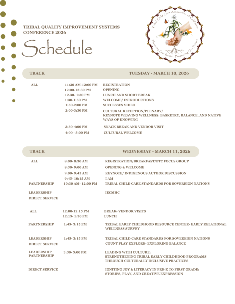 The 2026 conference will offer meaningful opportunities for gathering, learning, collaboration, and cultural connection as we continue strengthening Tribal programs, providers, families, and communities across our QCC Region 11.